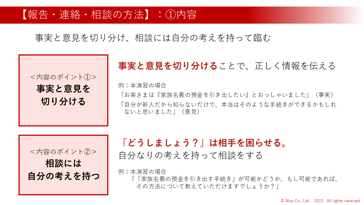 2 | Part1:内容と伝え方のポイント | ホウ・レン・ソウの4つのポイントのうち「内容」と「伝え方」について留意すべきことを学ぶ | 動画 | 4 |