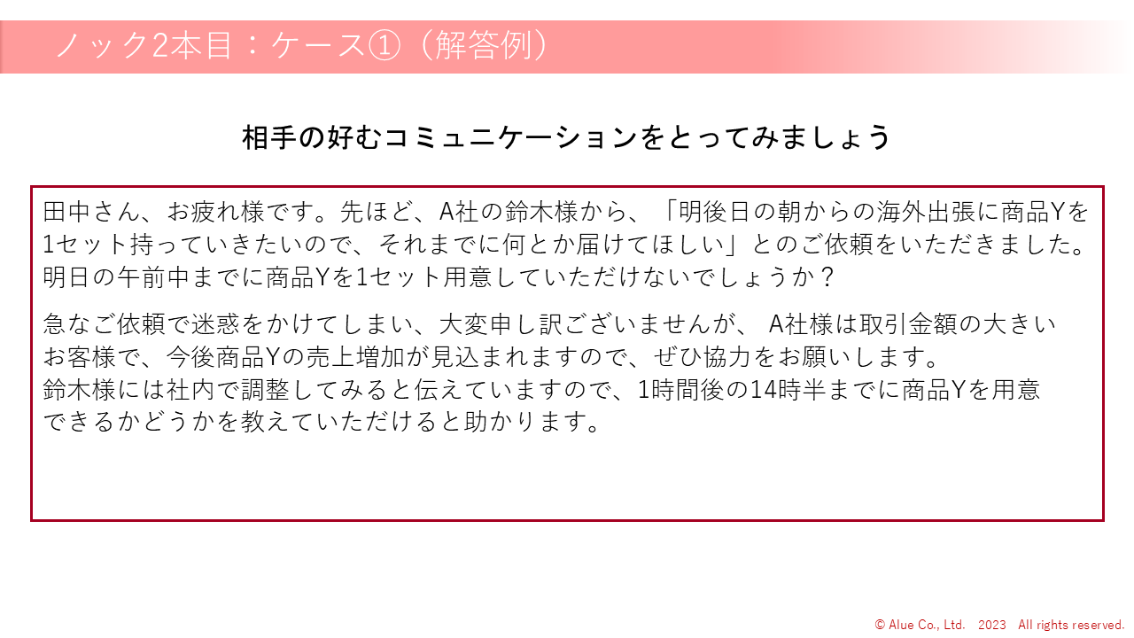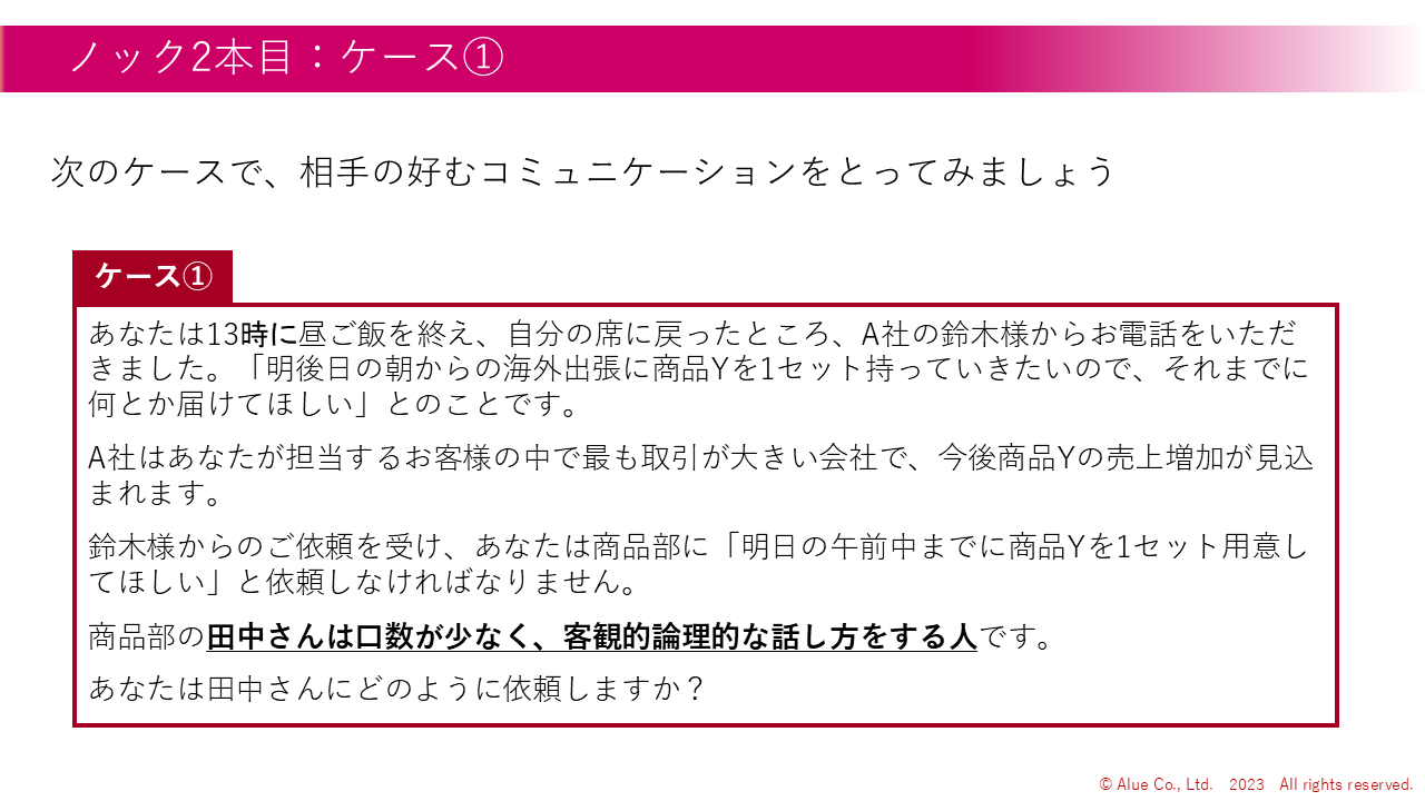 10 | 上司に進言するケースを通して相手が大切にしていることを受け止めた上で自分の意見を配慮しながら伝える方法を学ぶ(×2問) | 演習 | 15 |