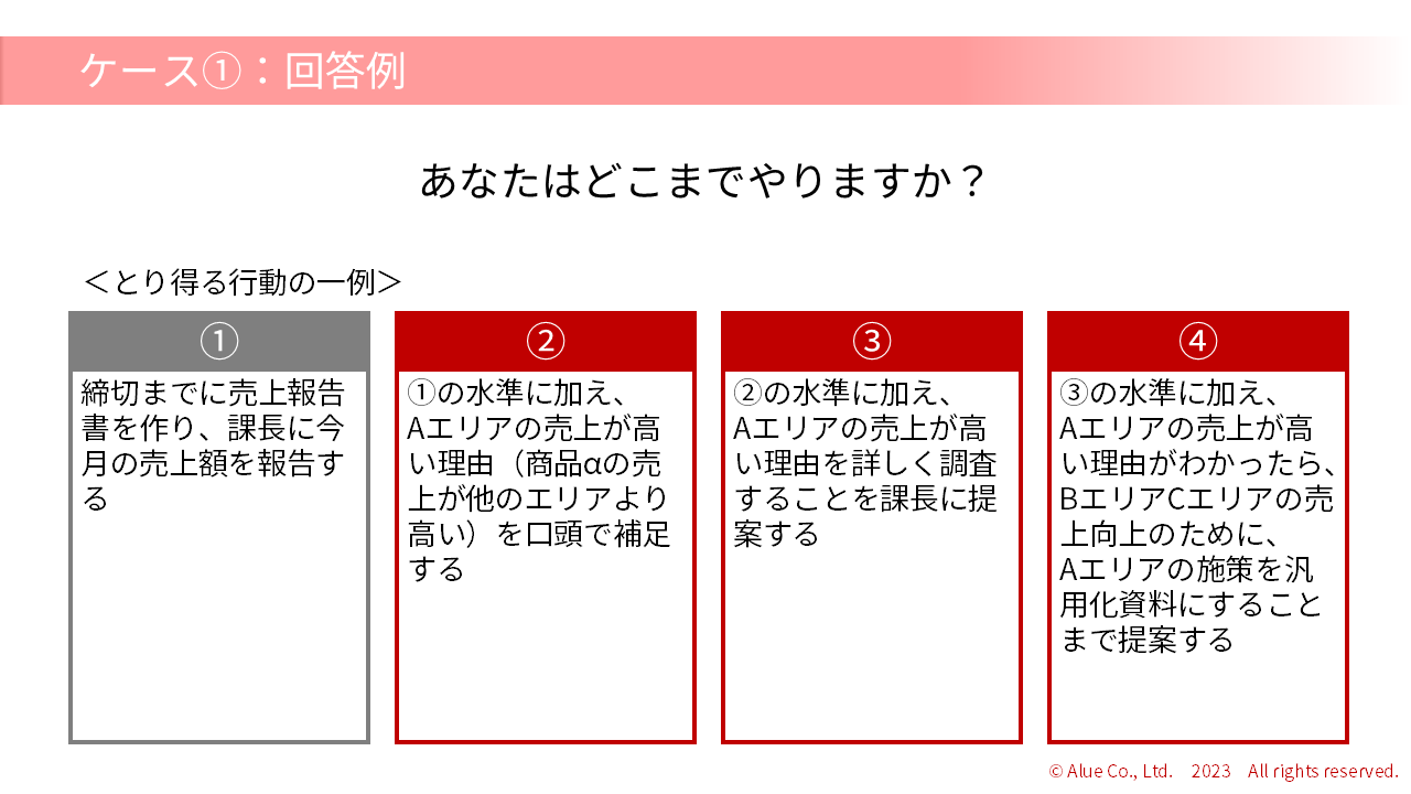 7 | プラスアルファの価値を届けられそうなケースを提示し、それぞれでどのように行動するか考える(×3問) | 演習 | 15 | |
