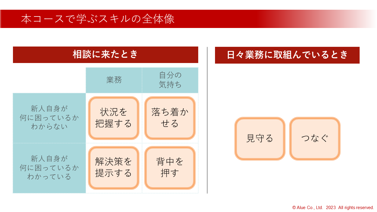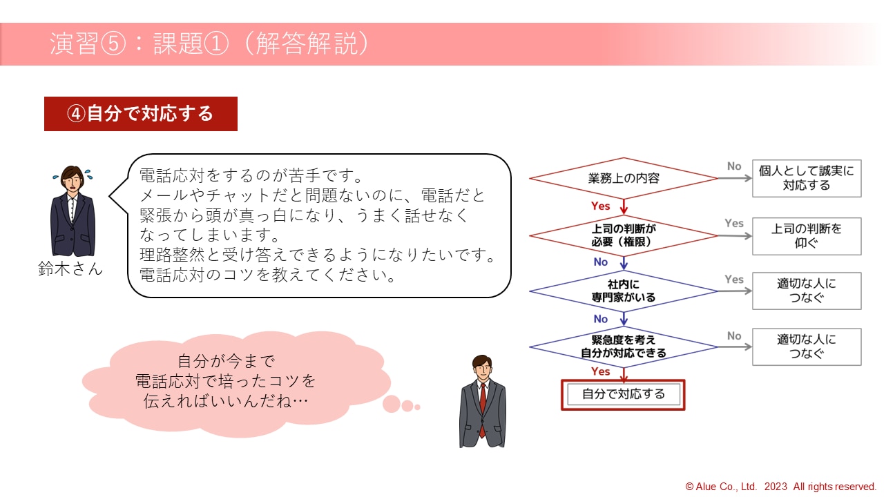 4 | ストーリーを読み、新人の対応のどこがいけなかったのか考え(×1問)、先輩として新人の相談に乗る(×1問)演習を実施する | 演習 | 10 | |
