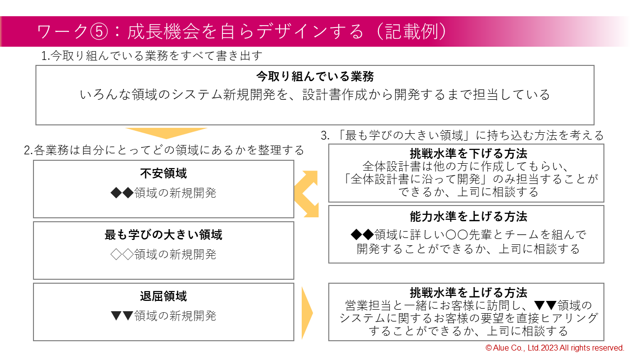10 | 自分が取り組んでいる仕事を振り返り、自分の能力を高めるための3つの要素を含んでいるか、また、学びの大きい領域の業務になっているかどうか考える | 演習 | 10 | |