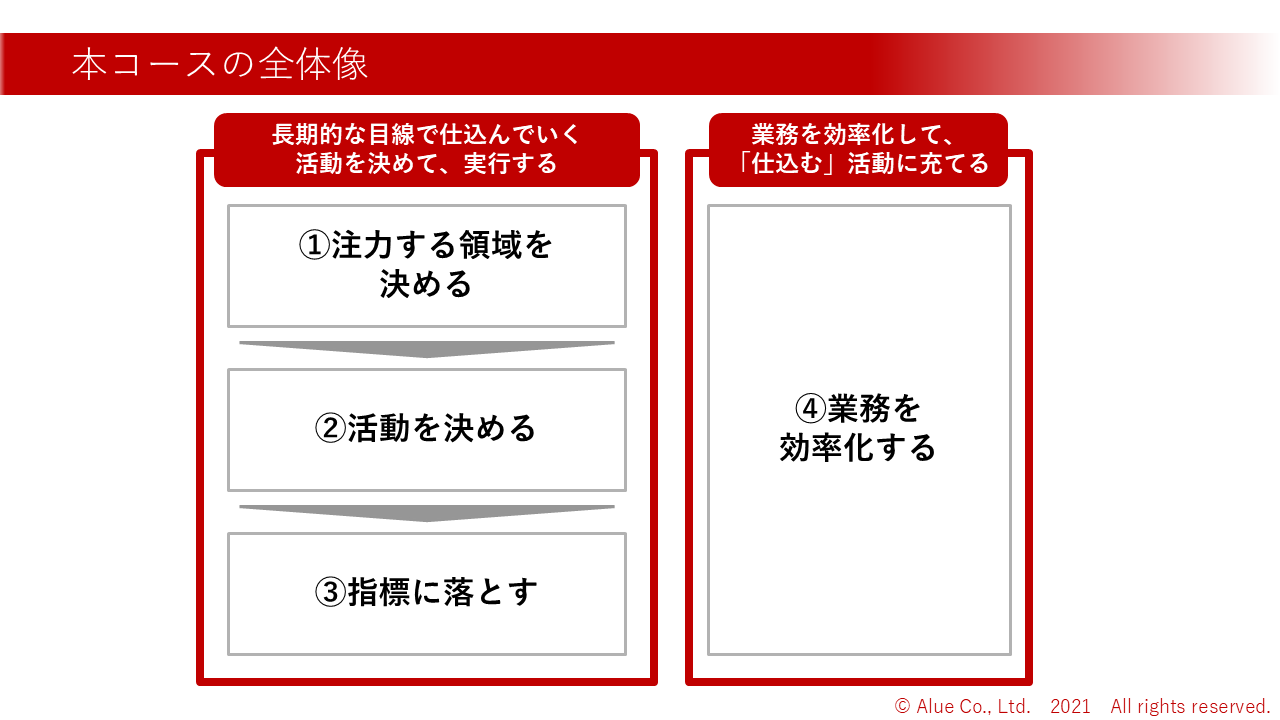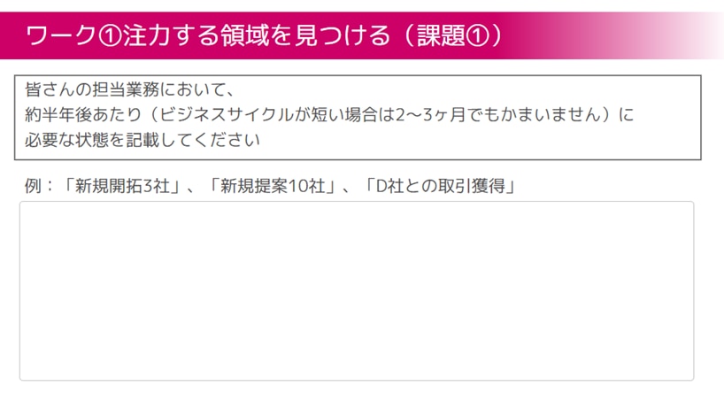 2 | STEP1:注力する領域を決める | 自身の担当業務において目標達成に大きな影響を与える業務を把握するためのステップと観点を学ぶ | 動画 | 3 |