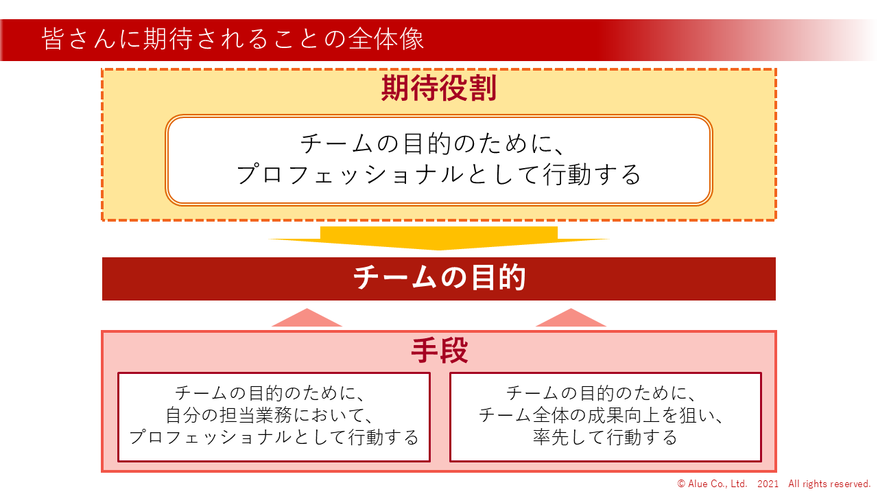 2 | 今後皆さんには、チームの目的を実現し、チーム全体で高い成果をあげるために、率先垂範して高い基準で行動することが求められる | スライド | 3 | |