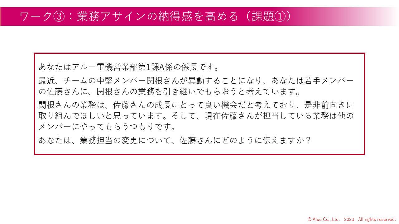 8 | 若手メンバーに業務を引き継いでもらう設定で、どのように担当業務の変更について伝えるかを考える(×2問) | 演習 | 30 | |