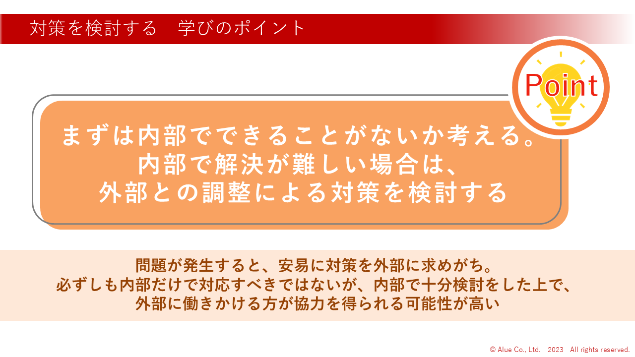 対策を検討する | 内部調整から外部協力まで段階的対応を習得 |