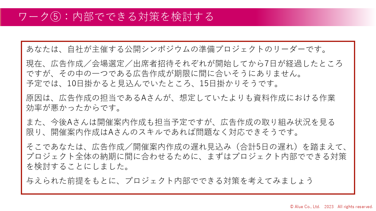 4 | プロジェクト納期を守るために出来ることを考える(×1問) 納期を守るためにプロジェクト内部で出来る対策を考える(×1問) 外部との調整により納期を間に合わせる方法を考える(×1問) | 演習 | 25 | |