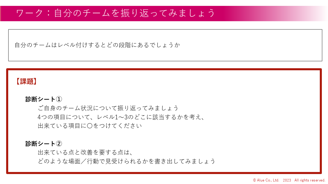 9 | 自分のチームをレベル分けして、協働関係がどの段階にあるのか診断する(×1問) 自身の適応課題を考える(×4問) | 演習 | 15 |