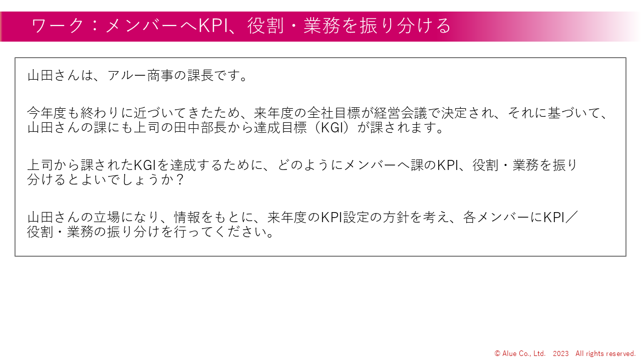 5 | 上司から課されたKGIを達成するために、どのようにメンバーへ課のKPI、役割・業務を振り分けるとよいか考える(×1問) 自身の適応課題を考える(×4問) | 演習 | 15 | |