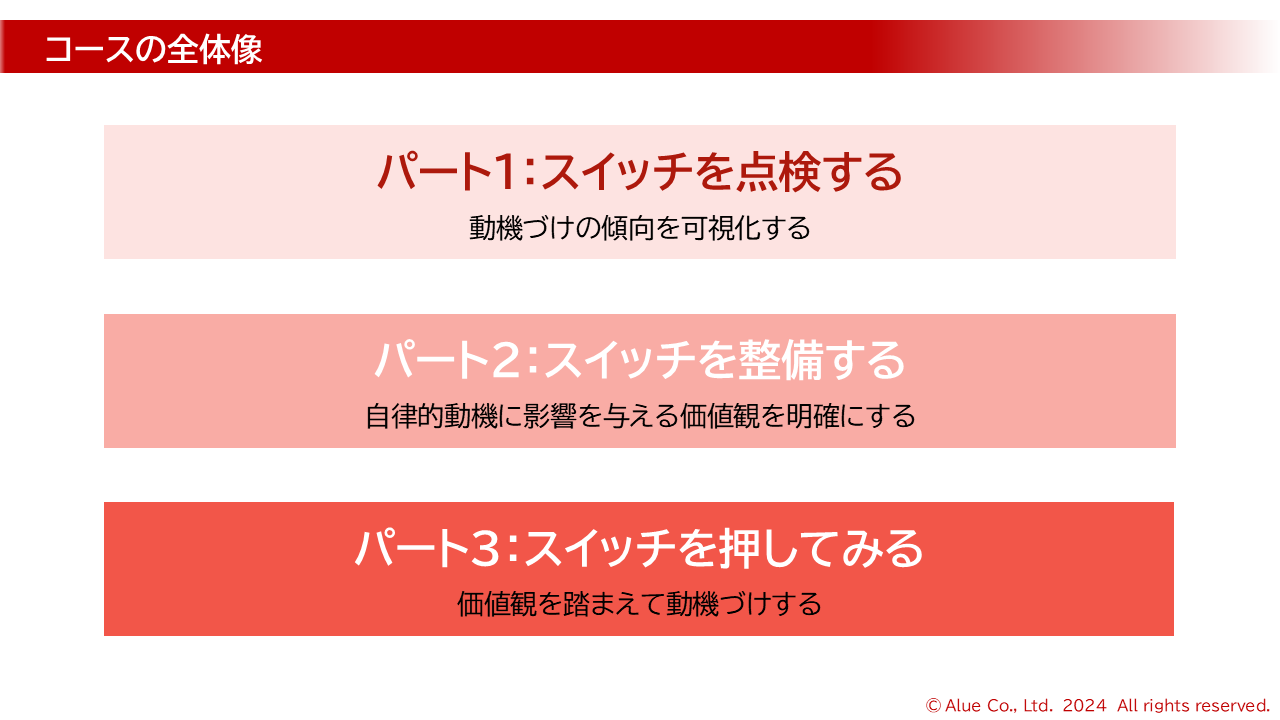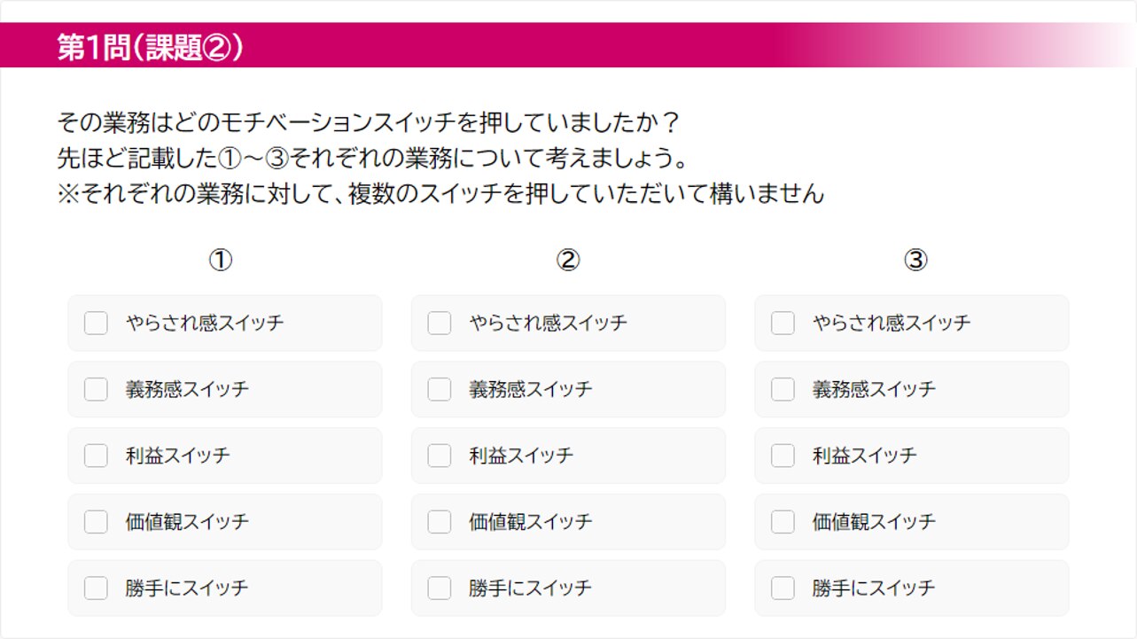 7 | スイッチを押してみる | 価値観や担当業務を捉え直して自分を動機づけるための方法について学ぶ | 動画 | 5 |