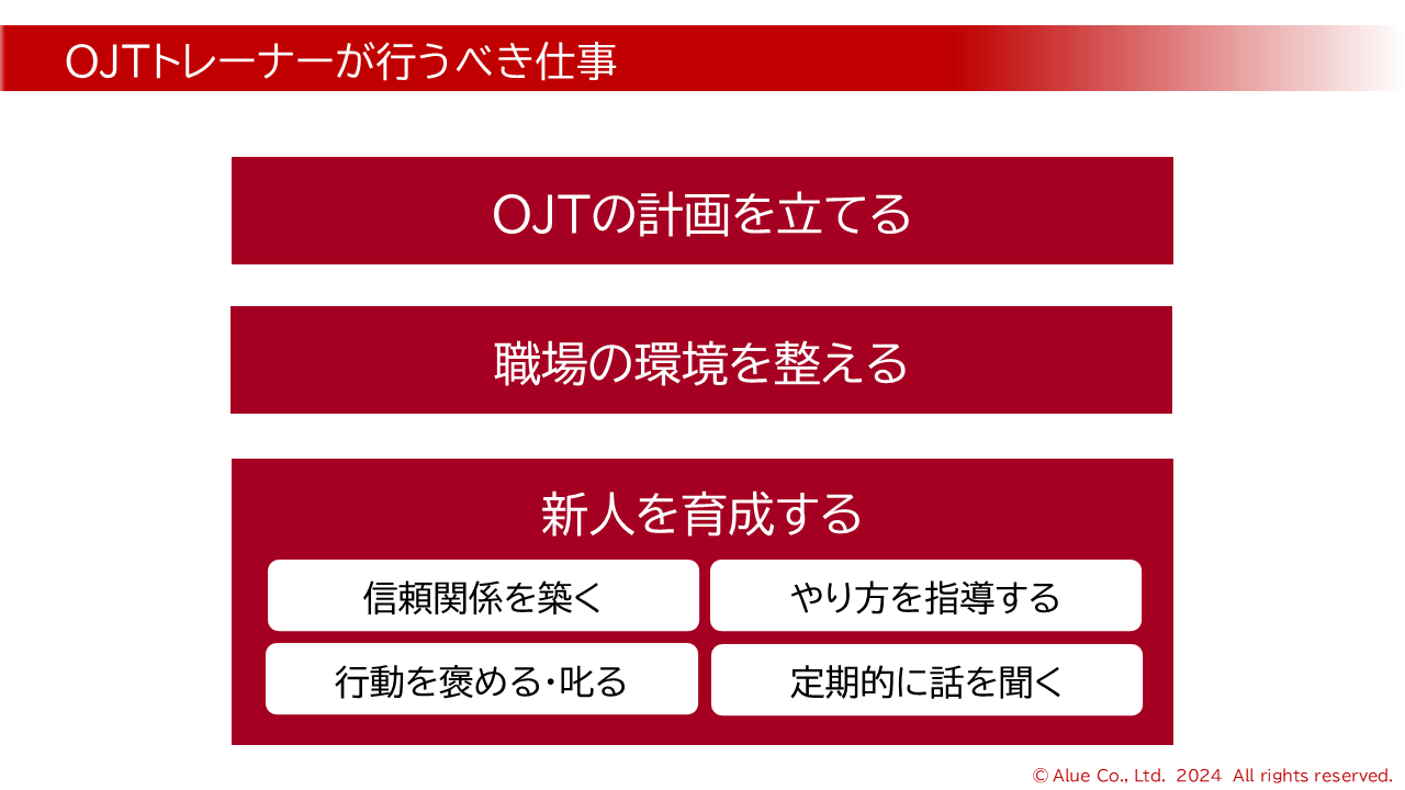 7 | Point3:OJTトレーナーの行うべき仕事 | OJTトレーナーが行うべき仕事について学ぶ | 動画 | 6 |
