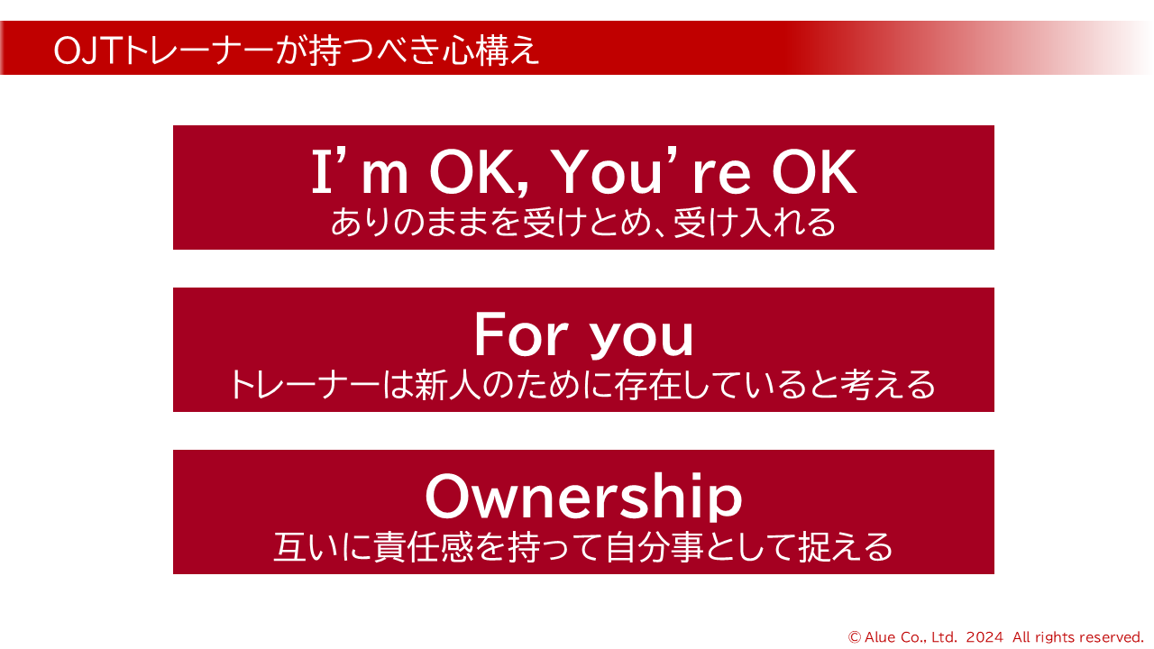 2 | Point1:OJTトレーナーが持つべき心構え | OJTトレーナーが持つべき3つの心構えについて学ぶ | 動画 | 6 |