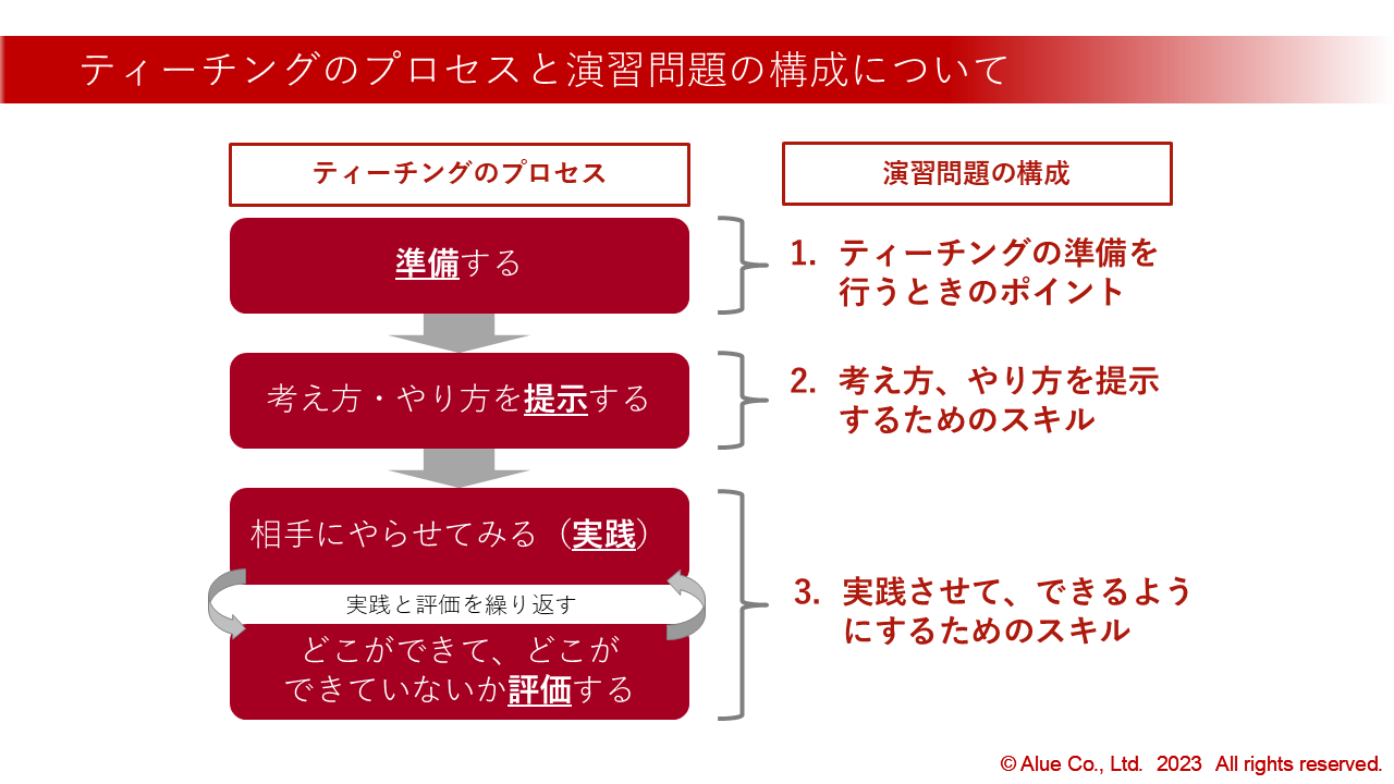 1 | イントロダクション | ティーチングとは何か、ティーチングのゴールとは何かを学ぶ | 動画 | 4 |
