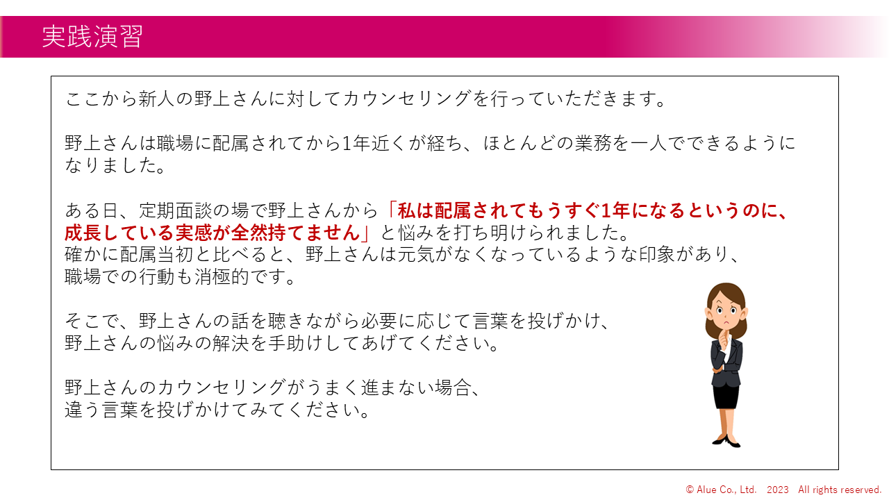 7 | 実践編演習 | ケースで選択肢を選びながら、新人に対してカウンセリングを行う(×2問) | 演習 | 10 |
