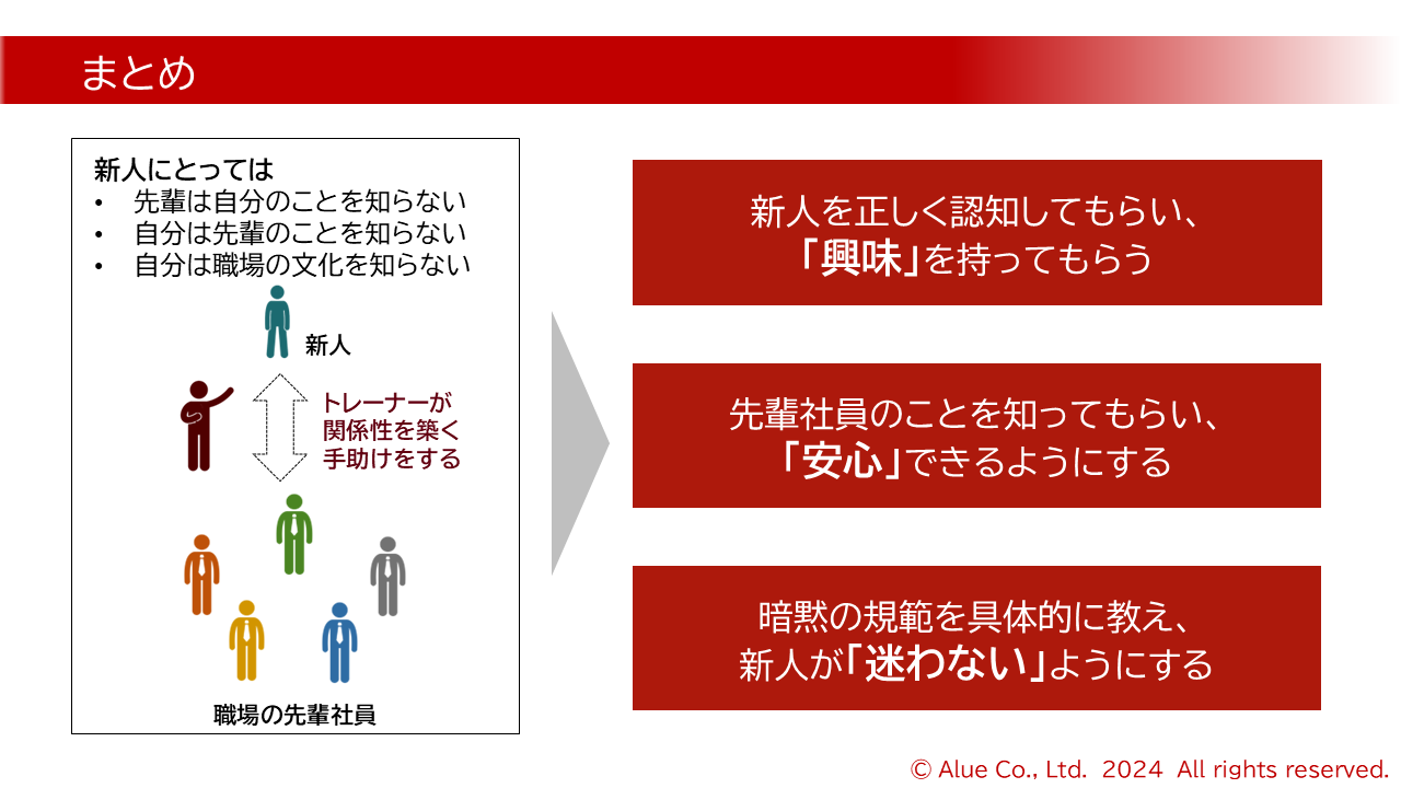 3 | Point1:新人と周囲の良好な関係性を築く | 新人と良い関係性を築くためのポイント3つについて学ぶ | 動画 | 6 |