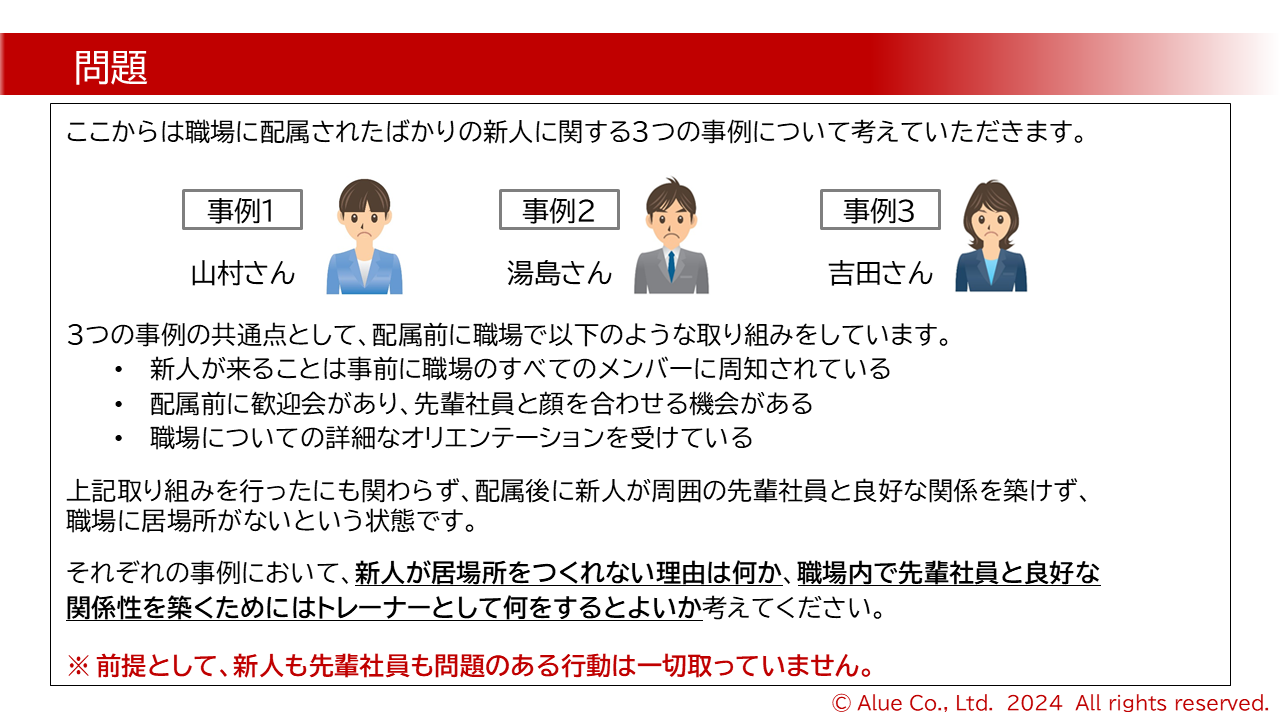 5 | 実践編演習 | 職場で居場所を作れていない新人が、先輩社員と良好な関係性を作るためにどのようにしたらよいか考える(×3問) | 演習 | 10 |