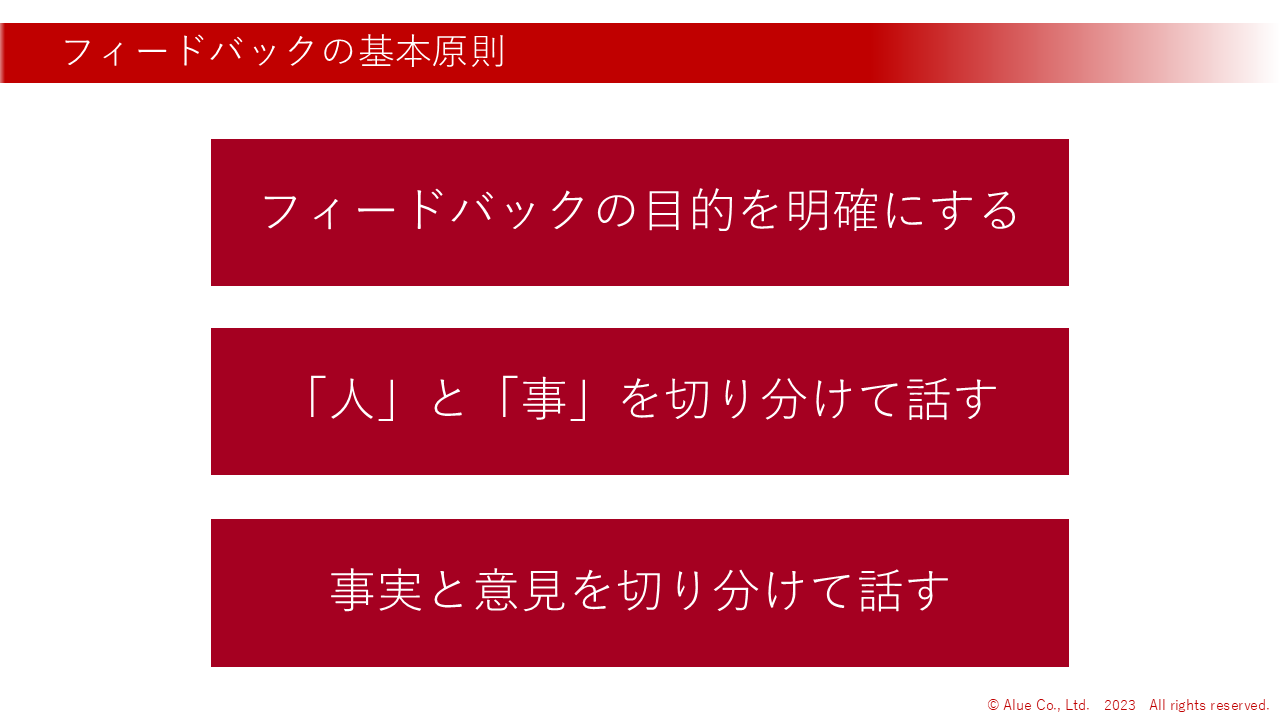フィードバックの | 目的の明確化と適切な伝達方法を習得 |