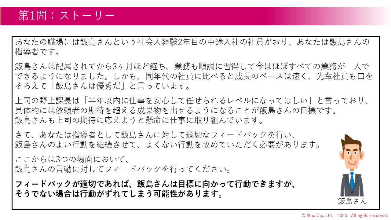 5 | 基礎編 | 褒めたいと思っている新人のケースを見て、どのようにポジティブフィードバックをするか考える(×3問) | 演習 | 20 |